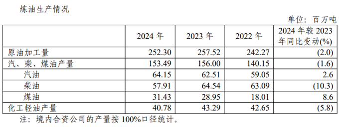 2024年,本公司积极应对部分产品需求疲弱和毛利收窄带来的挑战,坚持产销一体运行优化,加强区域优化,全力做大有效益的加工量,保持较高负荷率。紧贴产业链需求统筹原油资源,降低采购成本;根据市场需求,灵活调整产品结构和出口节奏,增产航煤,持续压降柴汽比;推进低成本“油转化”、高价值“油转特”,增产高端碳材料、特种油品等适销产品;加快基地建设,有序推进炼油结构调整项目。全年加工原油2.52亿吨,生产成品油1.53亿吨,其中,汽油产量同比增长2.6%,煤油产量同比增长8.6%。