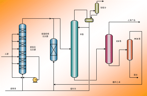 EBLC技术以石油苯和聚合级乙烯或浓乙烯为原料,采用循环固定床新工艺进行苯和乙烯液相烷基化反应生产乙苯。