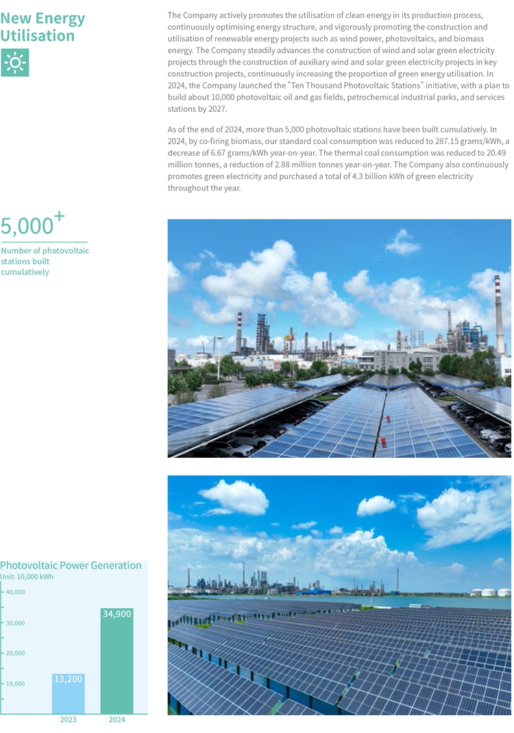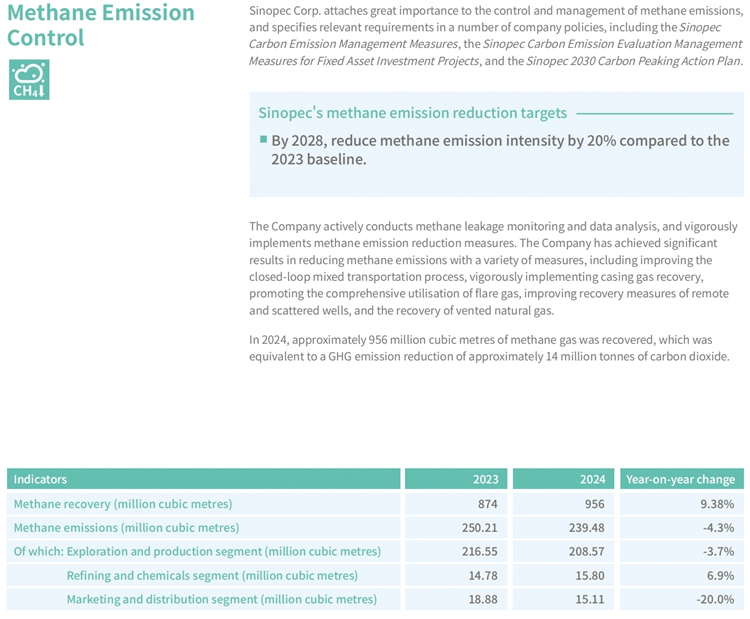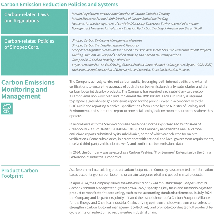 Sinopec Corp. places a strong emphasis on monitoring and controlling GHG emissions, conducts comprehensive audits and assessment of the carbon emissions of its subsidiaries, and ensuring robust carbon asset management. The Company reduces GHG emissions by implementing various "Energy Efficiency Improvement Projects", using new energy to replace traditional energy, research and application of CCUS technologies, and reduction of methane emissions, etc., continuously strengthening the "dual control" management of both total carbon emissions and carbon intensity.