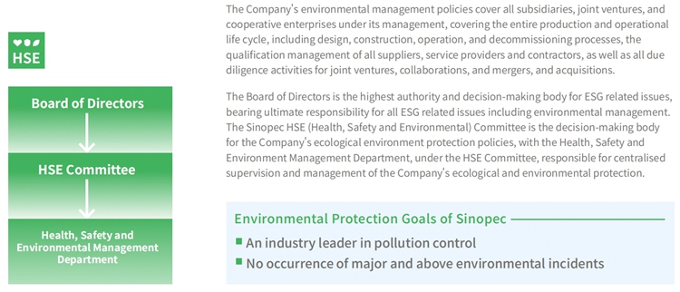 Sinopec Corp. vigorously implements the strategy of green and clean development, integrating the requirements of ecological environment protection into various aspects of corporate production and operation. The Company strictly complies with relevant environmental protection laws and regulations, establishes and continuously improves the environmental protection policies and systems. Adhering to the principle that "environmental protection starts from design, quality, responsibility, and capability", the Company comprehensively implements clean production initiatives and actively practices the concept of green and low-carbon development.