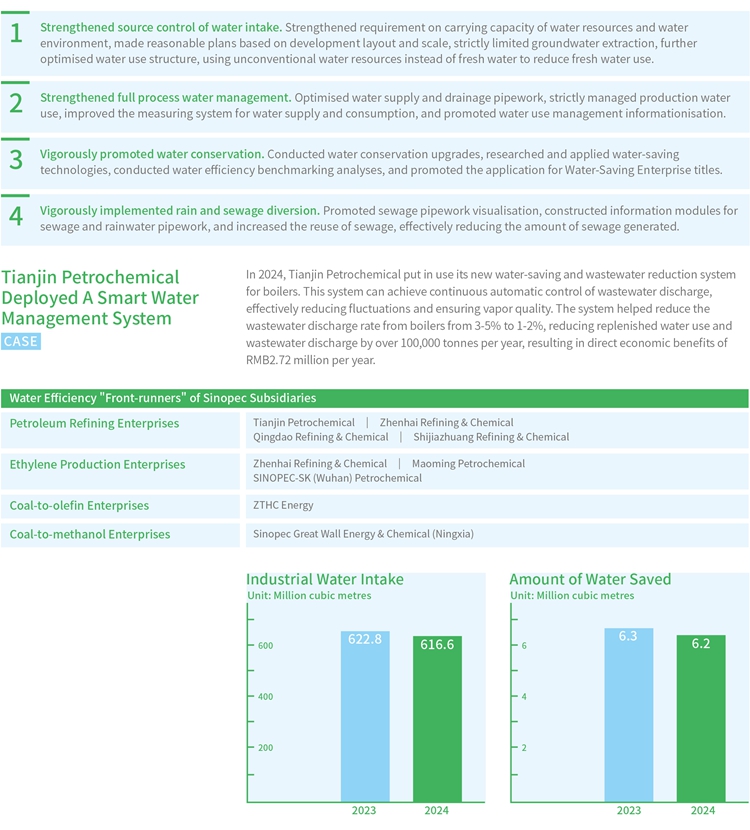 Sinopec Corp. has formulated policies such as the Sinopec Water Conservation Management Measures, the Sinopec's Guidance on Water Conservation Work in the 14th Five-Year Plan, and the Sinopec's Detailed Rules for Energy and Environmental Source Control of Construction Projects (Refining Segment) in accordance with the requirements of relevant national laws and regulations such as the Water Law of the People's Republic of China, the Regulations on Groundwater Management, the Regulations on Water Withdrawal Permits and Water Resource Fee Collection, the Management Measures for Water Resource Demonstration of Construction Projects, the Management Measures for Water Withdrawal Permits, and Water Conservation Regulations. The Company strives to continuously conserve water resources and use water resources more efficiently with the goal of "reducing industrial water intake by no less than 1% annually". In 2024, the Company's industrial water intake was 616.6 million cubic metres, a decrease of 1% year-on-year, saving 6.20 million cubic metres of water. The Company currently has no challenges in both the access and utilisation of water resources.