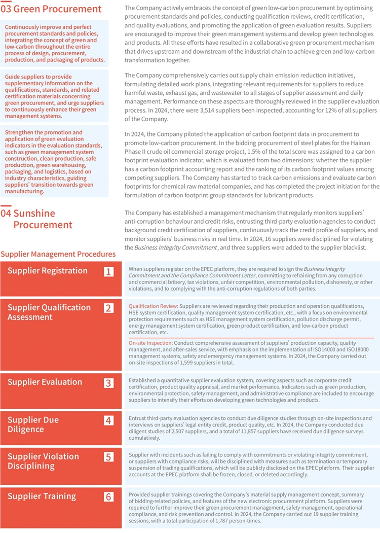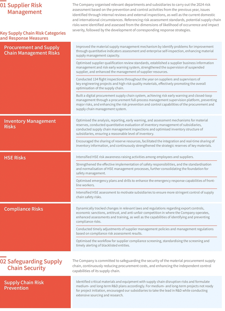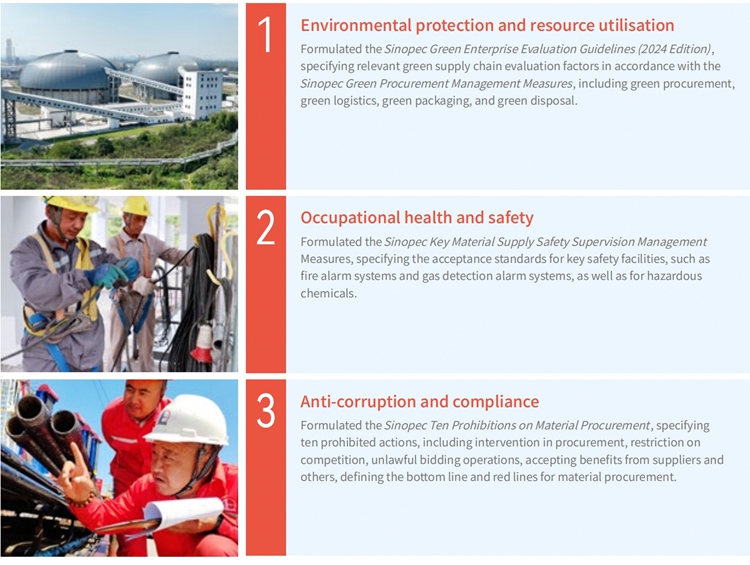 The Company has formulated a series of management policies, such as the Sinopec Material Supply Management Regulations, the Sinopec Green Procurement Management Measures, and the Sinopec Key Material Supply Security Supervision and Management Measures, forming a scientific, standardised, and comprehensive procurement and supply chain management system. The Company also cooperates with suppliers extensively on accelerating the digital transformation of the supply chain, continuously enhancing the strategic support, resource assurance, value creation, risk management capability, and security resilience of its supply chain.