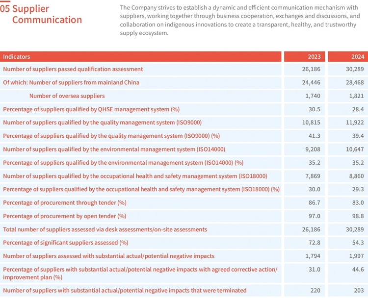 Sinopec Corp. attaches great importance to supply chain management, and strives to adhere to the concepts of sunshine procurement and green procurement and actively integrate ESG concepts and requirements into the management system of suppliers and contractors. The Company is committed to continuously optimising supply chain management, safeguarding supply chain security, aiming at building a transparent, healthy, and honest ecosystem with supply chain partners through opening-up and strategic cooperation.