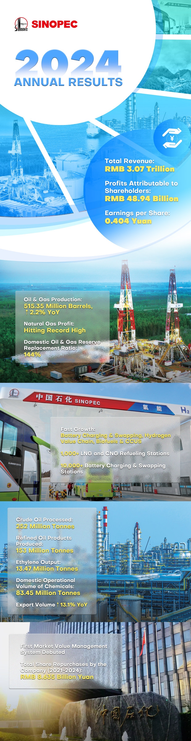 On March 23rd, China Petroleum & Chemical Corporation ("Sinopec Corp." or the "Company") (HKEX: 386; SSE: 600028) unveiled its annual results for FY2024. In accordance with IFRS, the Company’s revenue reached RMB 3.07 trillion. Profit attributable to shareholders of the Company was RMB 48.94 billion. Basic earnings per share were RMB 0.404. Taking into account shareholders’ return, the total annual cash dividend amounted to RMB 0.286 per share (tax-inclusive). Aggregating the share repurchase amount during the year, total payout ratio of FY2024 reached 75%.